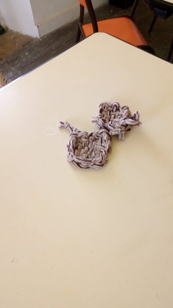 éponges confectionnées à partir de collants en nylon, de chaussettes, de tee-shirt… à l’aide d’un métier à tisser
